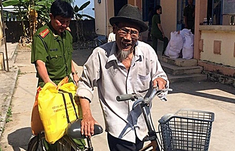 Thượng tá Trần Long Khánh hộ tống ông Bảy chở quà tết ra lộ về nhà. Ảnh: PHƯƠNG NAM