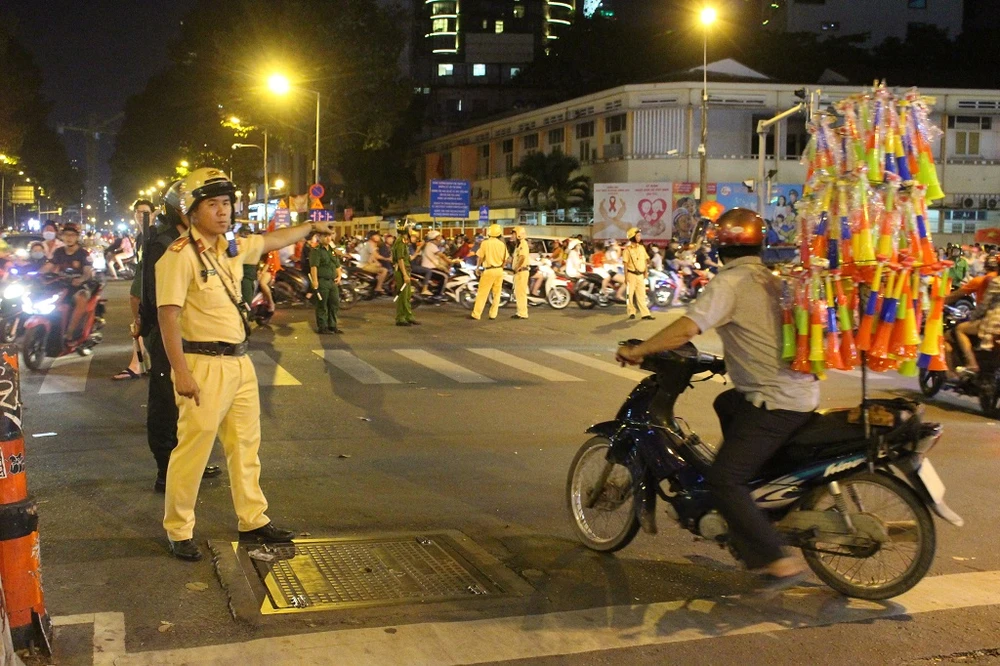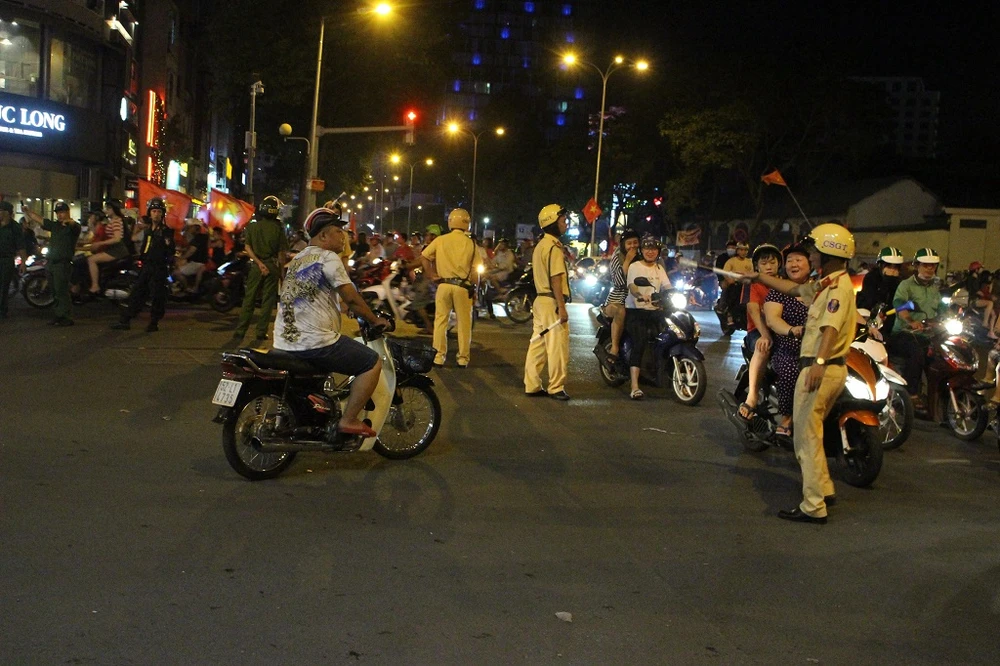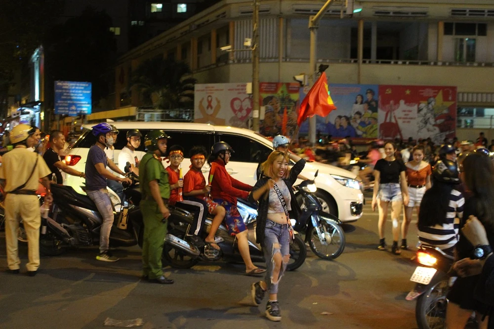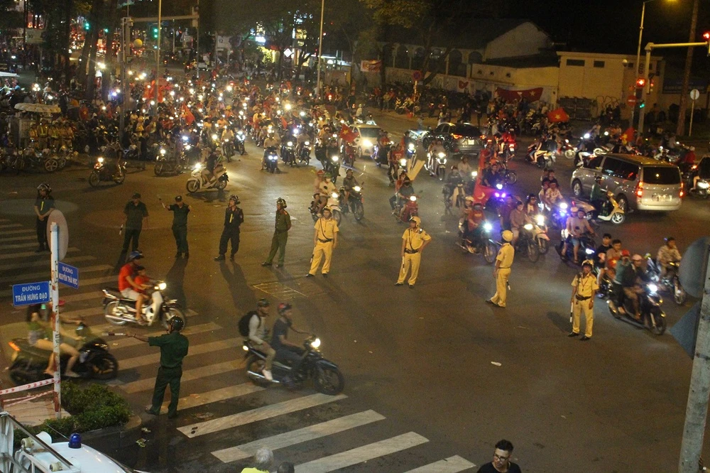 Khu vực Nguyễn Thái Học – Trần Hưng Đạo (quận 1) vẫn là điểm “nóng” vì náo loạn bởi dòng người cổ vũ từ nhiều nơi đổ về. Từ sớm, lực lượng CSGT, CS cơ động, CS hình sự, cùng với CSKV, BVDP, TNXP đã có mặt để điều tiết, phân luồng, hướng dẫn người dân cổ vũ an toàn, không tụ tập gây mất an ninh trật tự, an toàn giao thông.