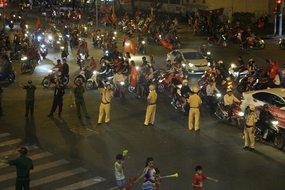 Trên rất nhiều tuyến đường tại khu vực trung tâm quận 1, TP.HCM, hàng ngàn người dân đã ùa ra cổ vũ đội tuyển. Các tuyến Lê Lai, Nguyễn Thái Học, Trần Hưng Đạo…. chật kín dòng xe, dòng người hò hét, thổi kèn.