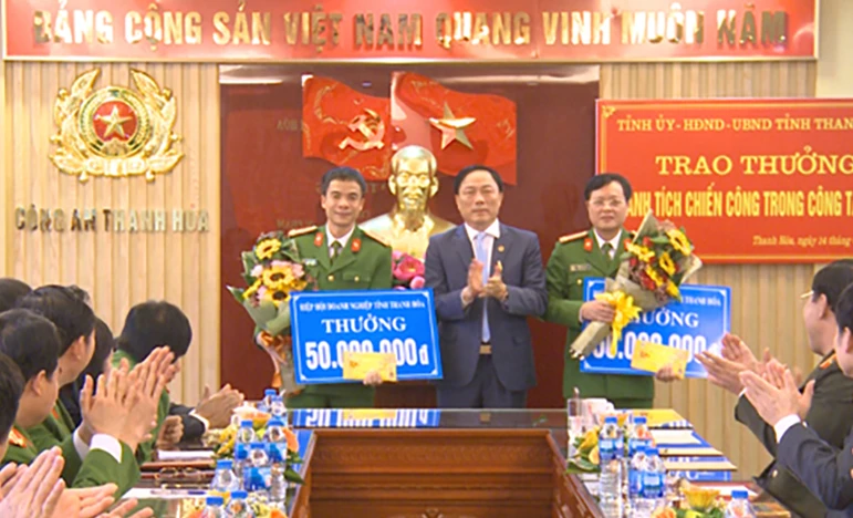 Sáng 14-2, Tỉnh ủy, UBND tỉnh, Giám đốc công an tỉnh Thanh Hóa và Hiệp hội doanh nghiệp tỉnh đã trao thưởng với tổng số tiền 330 triệu đồng cho Ban chuyên án, đơn vị thuộc Công an tỉnh Thanh Hóa trong đấu tranh trấn áp tội phạm trước, trong và sau tết Nguyên đán Kỷ Hợi 2019.