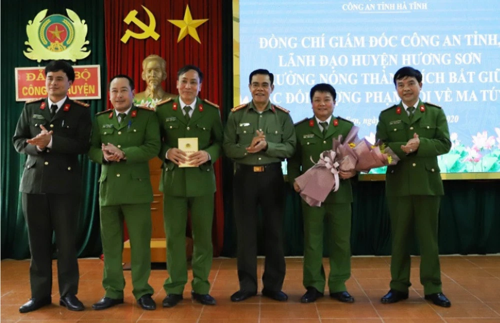 Đại tá Võ Trọng Hải – Giám đốc Công an tỉnh Hà Tĩnh đã tặng hoa, biểu dương, thưởng nóng cho Công an huyện Hương Sơn. Ảnh: Công an Hà Tĩnh