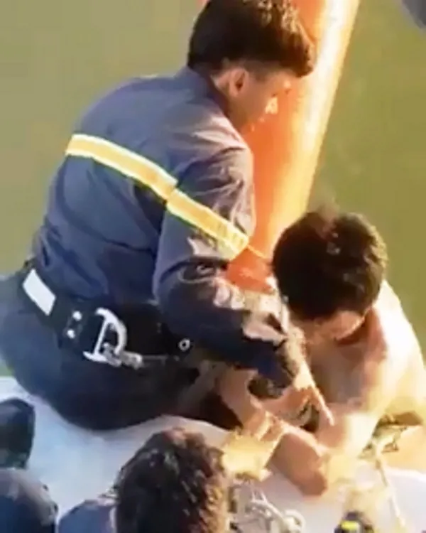 Sau gần một tiếng thuyết phục, anh ta mới chịu nghe lời lực lượng chức năng. Các chiến sĩ phải buộc dây an toàn từ trong thành cầu, chồm người ra dây văng để thắt dây an toàn cho thanh niên này trước khi đưa vào trong.