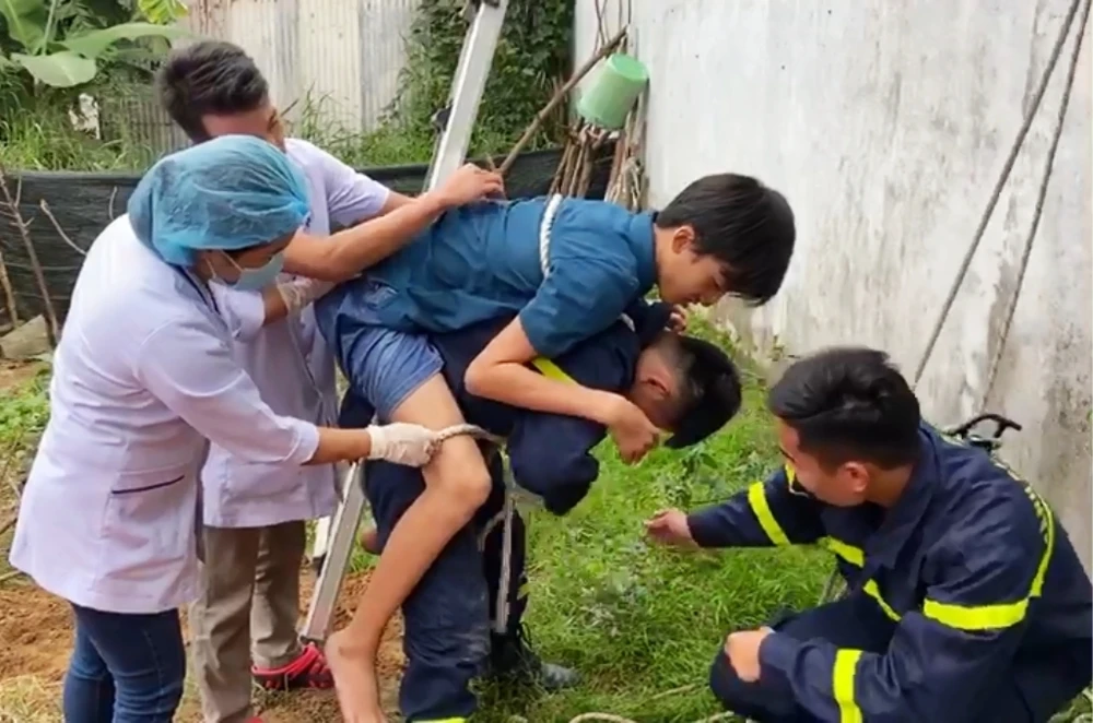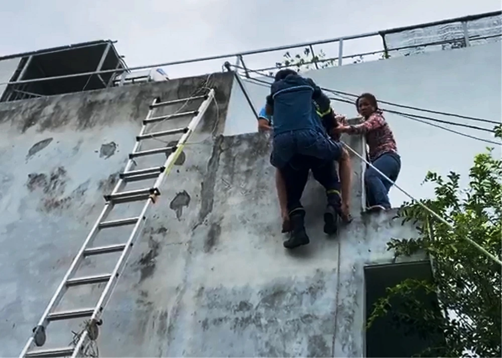 Nguyên rơi xuống mái tôn trên tầng 2 của nhà bên cạnh, bị chấn thương, không thể tự di chuyển xuống đất được. Người thân vội gọi lực lượng cứu hộ đến trợ giúp.