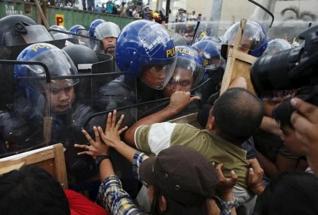 Đám đông biểu tình ẩu đả với lực lượng an ninh tại địa điểm tổ chức APEC ở Manila, Philippines hôm 19-11. Ảnh: Reuters