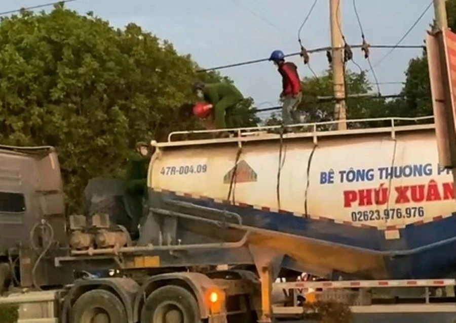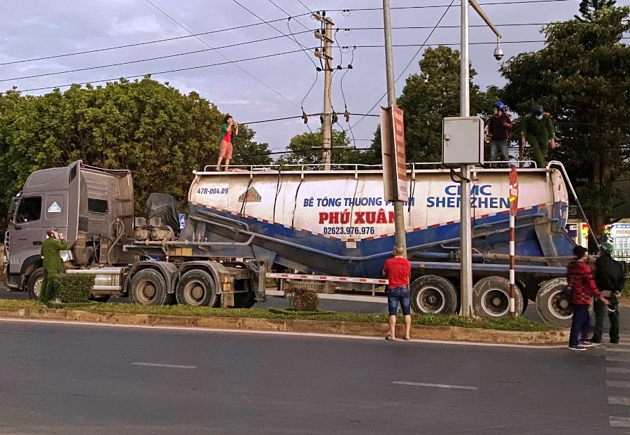 Cô gái cố thủ trên nóc xe đầu kéo. Ảnh: HẢI HIẾU