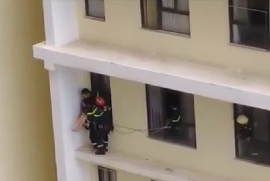 Cô gái có ý định tự tử từ tầng 18 chung cư được cảnh sát tiếp cận, giải cứu. Ảnh: Cắt từ clip