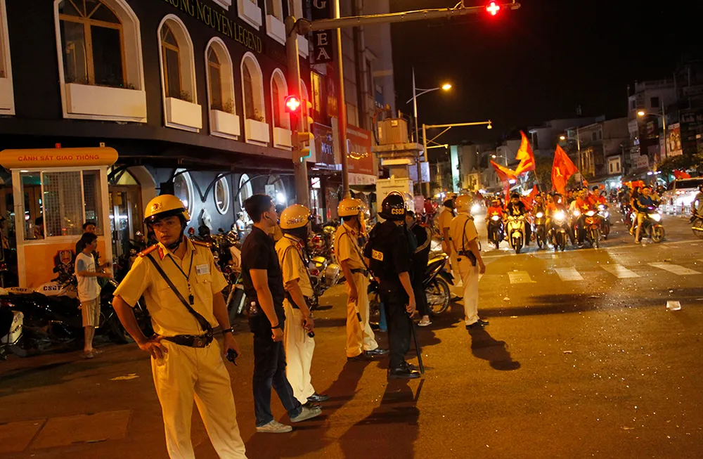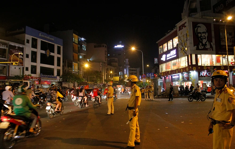 Cảnh sát giao thông chốt chặn tại nhiều tuyến đường sau chiến thắng của đội tuyển U23 Việt Nam. Ảnh: Nguyễn Tân