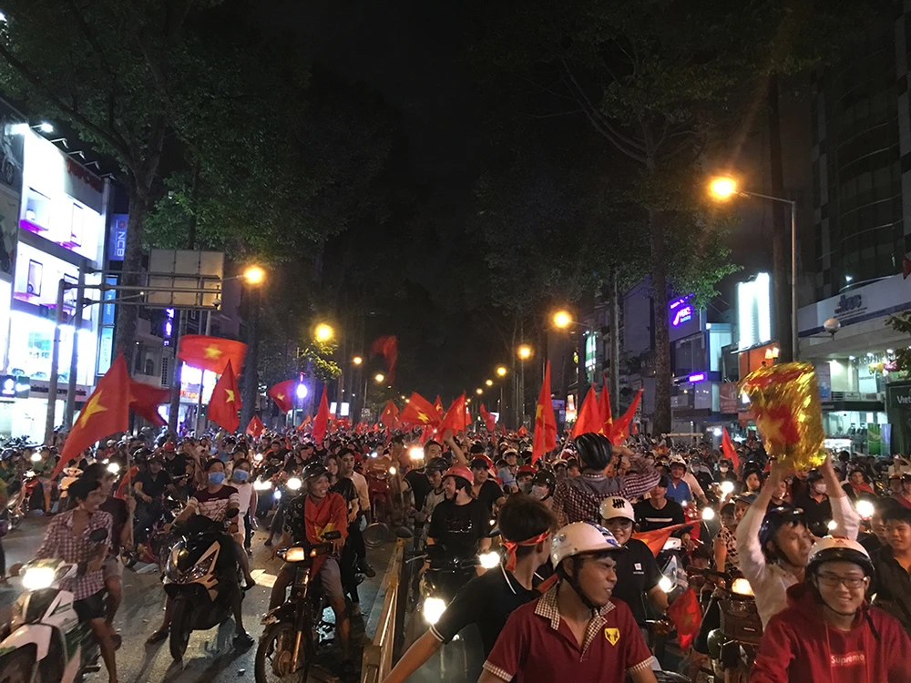 Trong khi đó, nhiều tuyến đường vẫn đông nghịt người ăn mừng chiến thắng. Ảnh: NguyễnTân