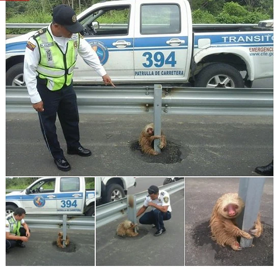 Trong những bức ảnh, chú lười - loài động vật chậm chạp nhất thế giới dường như đang cố gắng băng qua đường. Một viên cảnh sát từ Ủy ban quá cảnh đã giúp đỡ nó.
