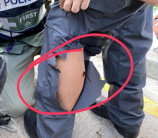 Viên cảnh sát bị tên găm vào chân. Ảnh: CNA