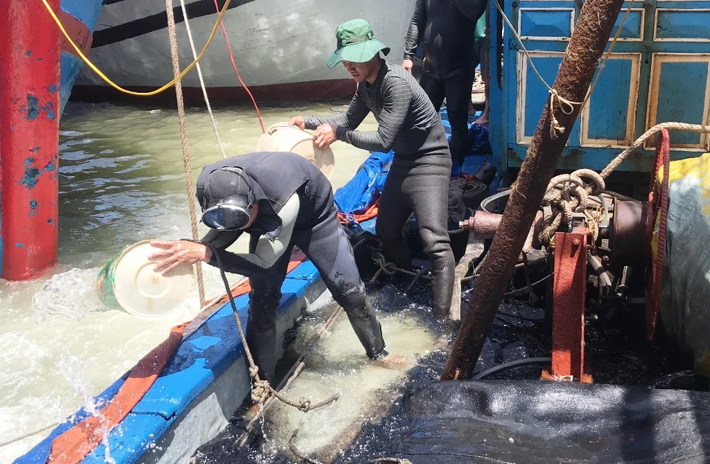 Tiếp đó, chủ tàu đã nhờ lực lượng trục vớt chuyên nghiệp đến lặn tìm phần thủng dưới đáy tàu. Mọi người đã vá tạm thời và bơm nước lên dần dần.