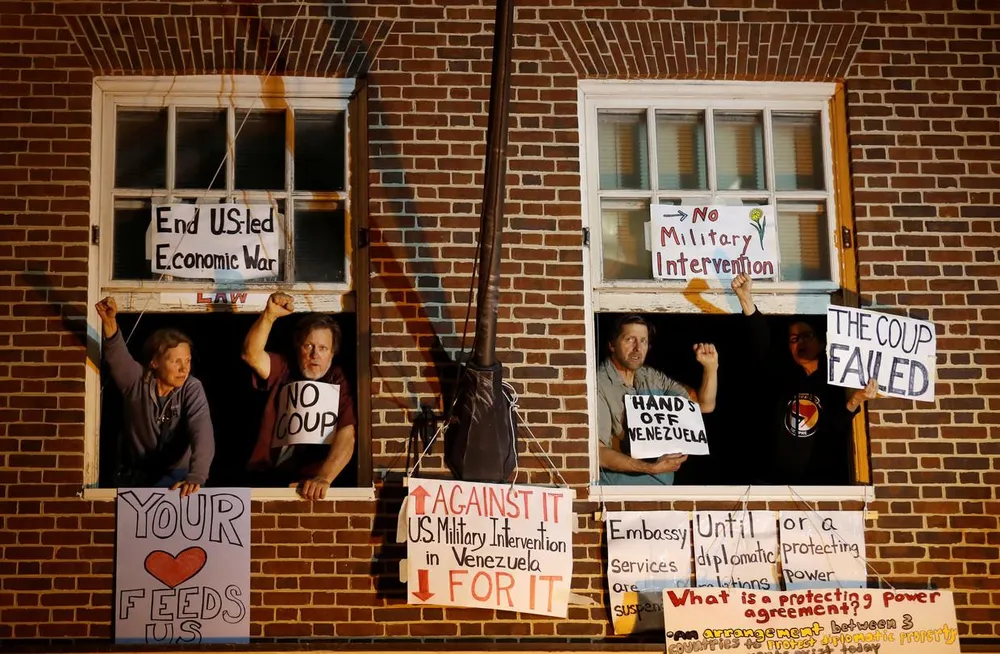 Các nhà hoạt động ủng hộ tổng thống Maduro đang ở tại tòa nhà Đại sứ quán Venezuela ở thủ đô Washington, DC, Mỹ. Ảnh: REUTERS