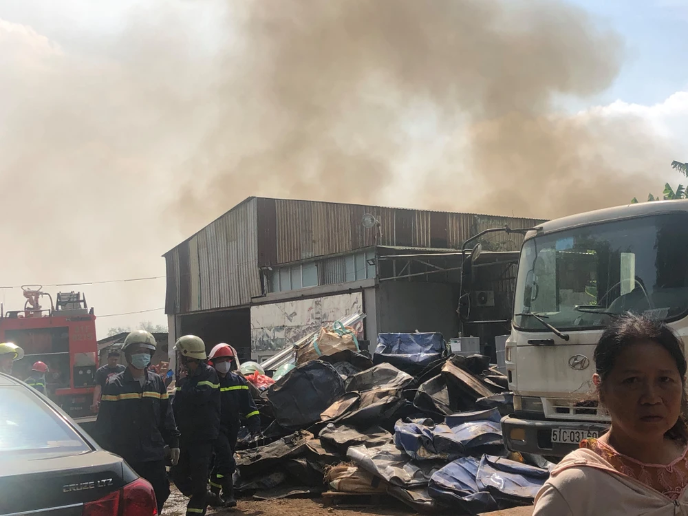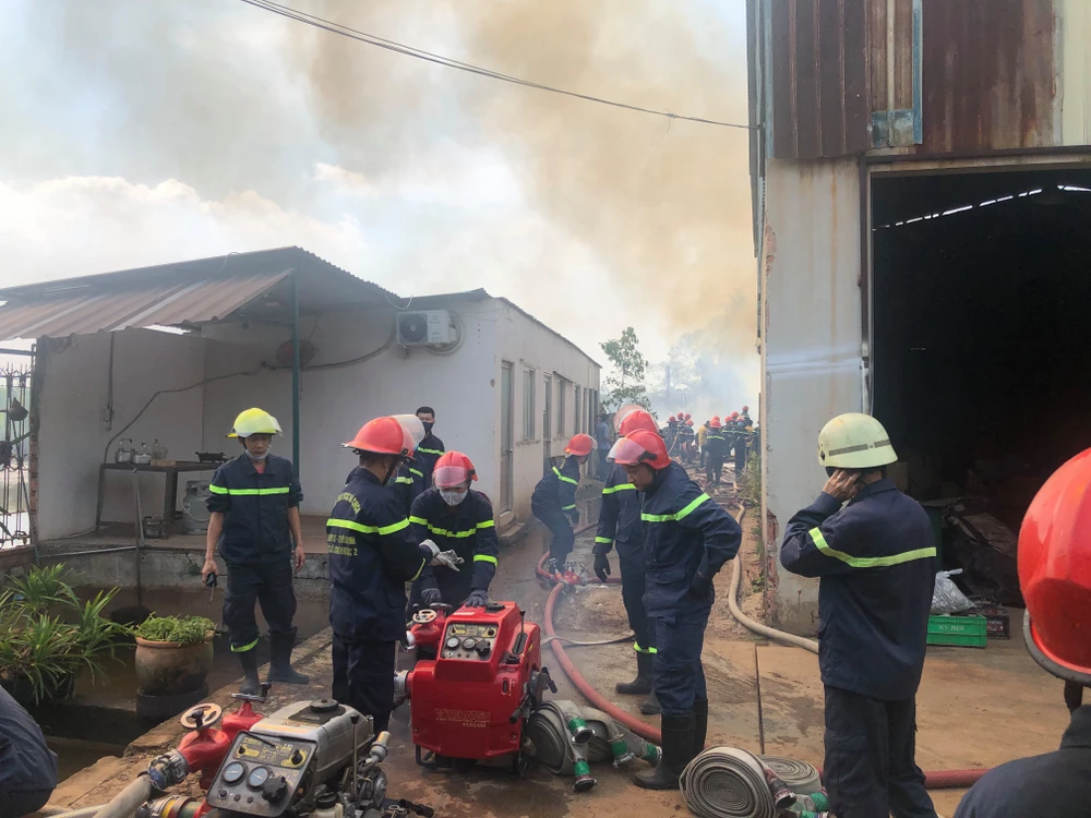 Lúc này, một số công nhân của một nhà xưởng gần đó đã dùng các thiết bị chữa cháy tại chỗ dập lửa, nhiều người khác bưng hàng hóa bên trong nhà xưởng ra ngoài.