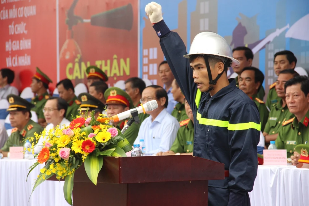 Thượng sĩ Nguyễn Tuấn Vũ - chiến sĩ Phòng Cảnh sát PCCC Quận Tân Phú - đại diện cho các vận động viên tham gia thi đấu lên tuyên thệ. Ảnh: NGUYỄN TRÀ