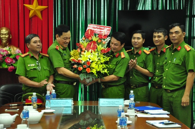 Thiếu tướng Đỗ Minh Dũng - Phó Cục trưởng Cục Cảnh sát PCCC- CNCH tặng hoa thăm hỏi Phòng cảnh sát PC&CC Bình Chánh
