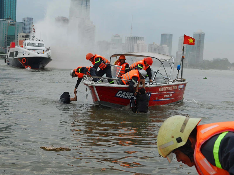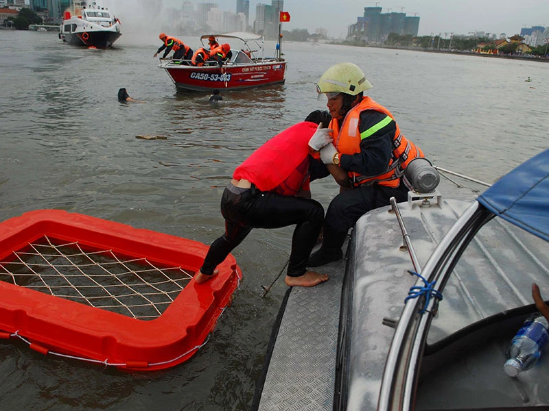 (PLO)- Cảnh sát PCCC TP.HCM diễn tập cứu hộ hai tàu khách đâm va trên sông Sài Gòn, 10 người phải nhảy xuống sông.