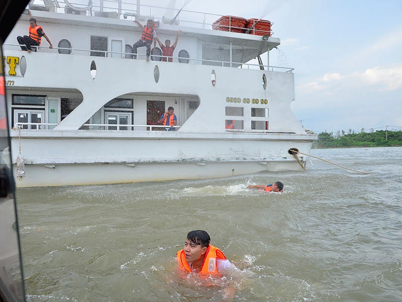 Phương án đặt ra là có nhiều người nhảy xuống sông. Ảnh Nguyễn Tân.