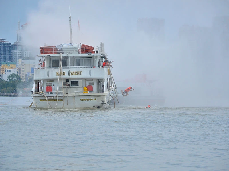 Tình huống thực tập chữa cháy thực hiện trên sông Sài Gòn. Ảnh Nguyễn Tân.