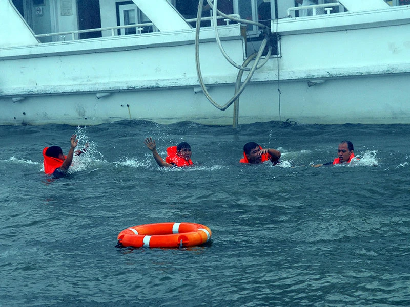 Tuy nhiên, việc ứng cứu gặp rất nhiều khó khăn, do trời mưa lớn và con nước chảy mạnh nên hầu hết những người rơi xuống bị nước cuốn trôi, không ôm được phao. Một thuyền viên tàu đã quyết định nhảy xuống sông để hỗ trợ, vớt và đưa những người bơi yếu bám vào các phao bè tạm thời cho lực lượng ứng cứu.