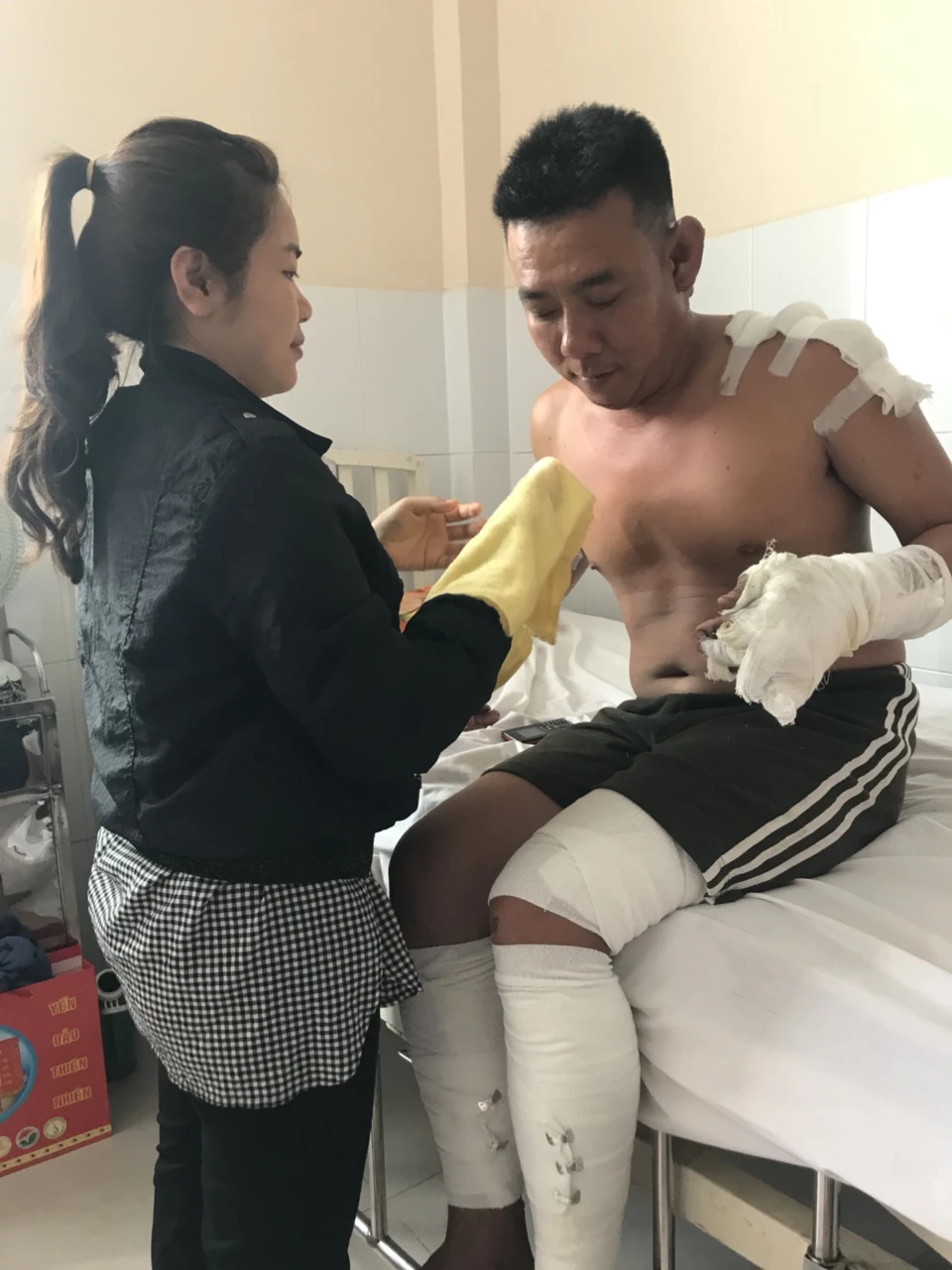 Đang điều trị tại bệnh viện Chợ Rẫy, chân tay và lưng Đại úy Trần Tuấn Thanh vẫn đang được băng kín do bỏng. Mọi hoạt động của anh vẫn còn khó khăn phải có người nhà hỗ trợ. Kể lại tình huống khiến tay anh bị bỏng tuột da lúc ấy, anh Thanh nói: “Lúc đó tôi đang làm nhiệm vụ ngay kế máy bơm thì nghe thấy có tiếng kêu khác thường. Nhìn lượng nước chảy ra, nghề của mình mà nên tôi biết chắc chắn máy có vấn đề, vừa chạy vội lại kiểm tra thì nó bung nổ, văng ra”, người lính cứu hỏa nhớ lại.