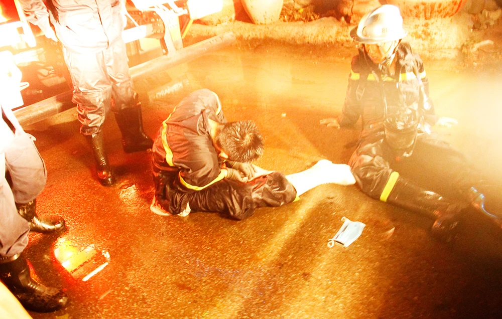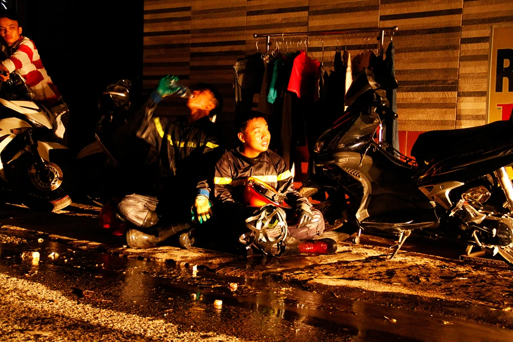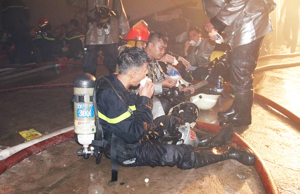Họ khá mệt mỏi và đuối sức vì việc tiếp cận vào sâu bên trong nhà kho đầy khói gặp không ít khó khăn do lượng bơ lớn chảy ra ngoài trơn trượt. Ảnh: Nguyễn Tân