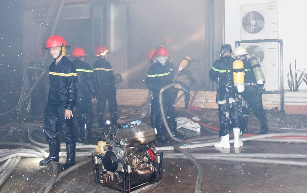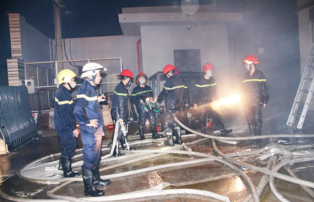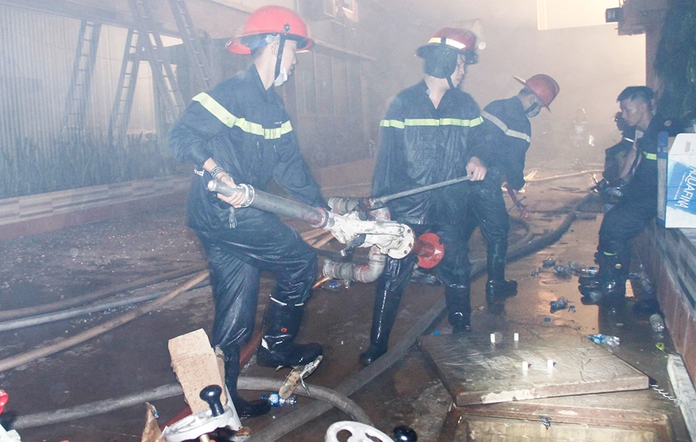 Đến khuya cùng ngày, nhiều cảnh sát PCCC vẫn đang bám trụ tại hiện trường, xịt nước tiếp cận các khu vực bên trong nhà kho. Ảnh: Nguyễn Tân
