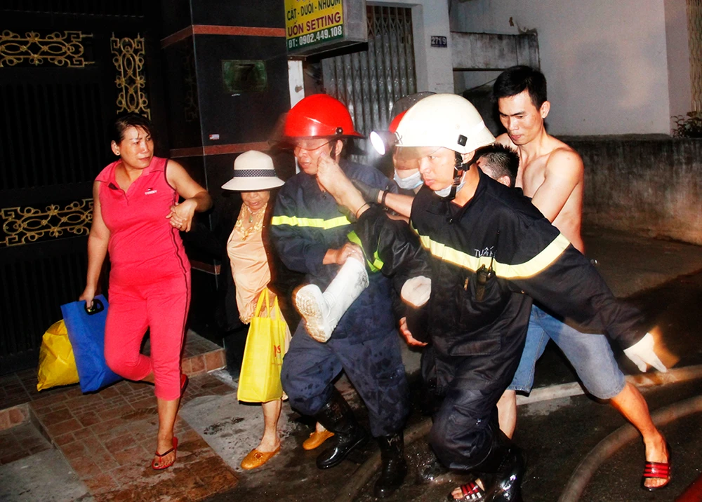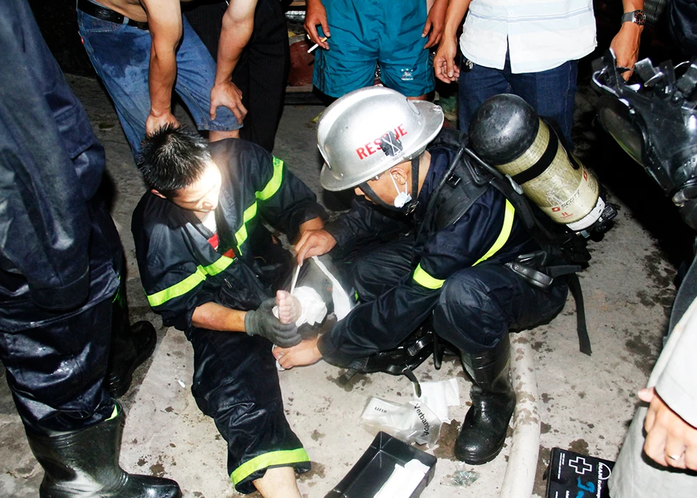 Trong quá trình chữa cháy, một chiến sĩ cảnh sát PCCC quận 6 đã bị thương do mảnh kính vỡ đâm vào chân. Ảnh: Nguyễn Tân