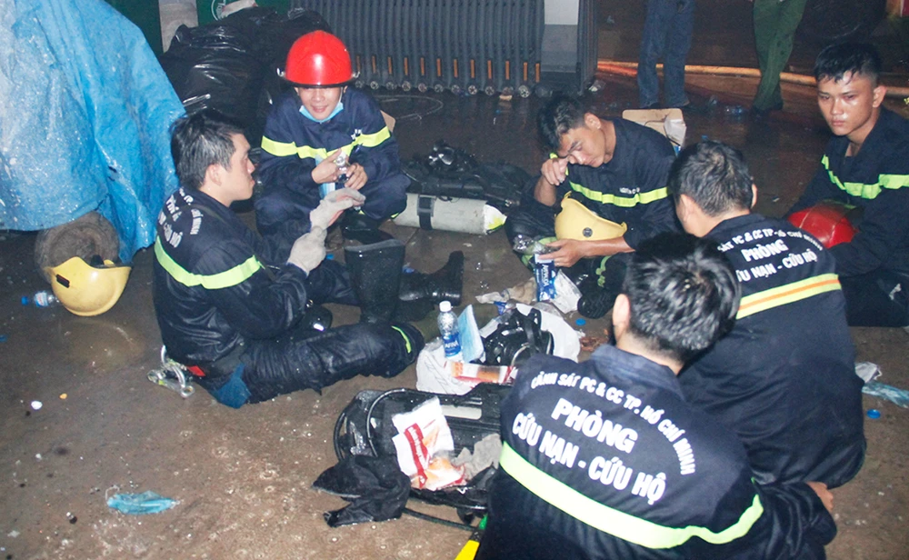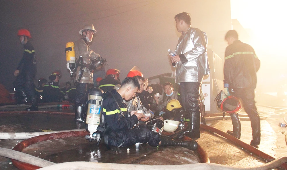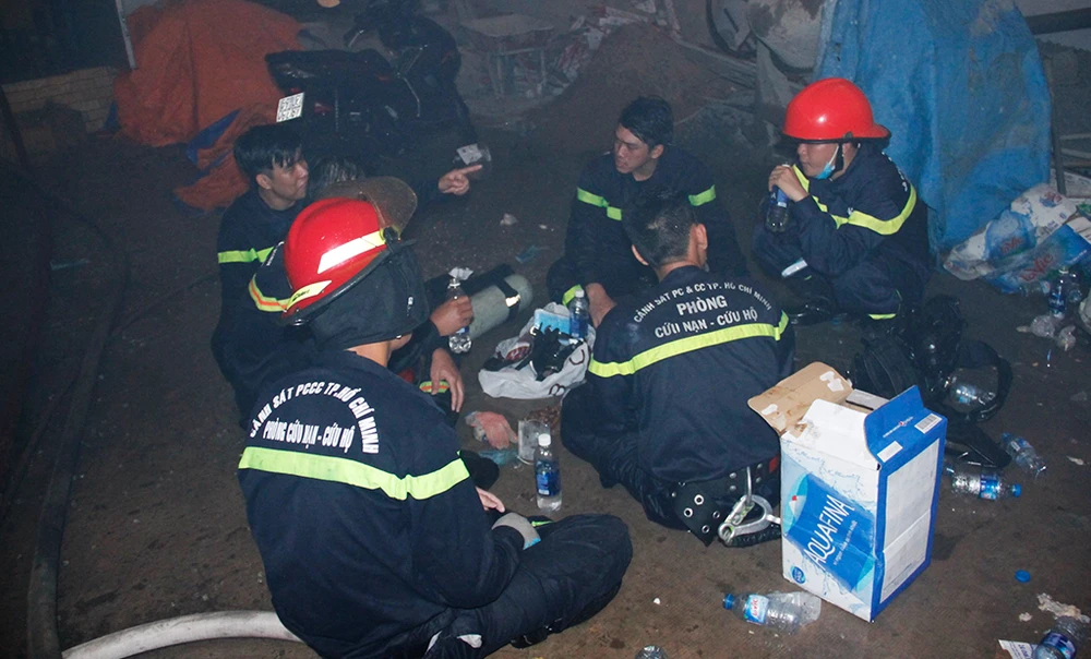 Đến khoảng 21 giờ, đám cháy cơ bản đã được dập tắt, nhiều cảnh sát PCCC tranh thủ ăn bánh mì, uống nước. Ảnh: Nguyễn Tân