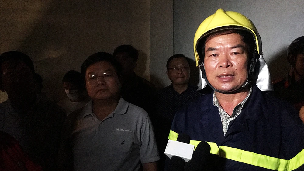 Đại tá Nguyễn Văn Băng, Phó Giám đốc Cảnh sát PCCC (bên phải) và ông Lê Văn Thinh, Chủ tịch UBND quận Bình Tân, có mặt ở hiện trường chỉ đạo công tác chữa cháy. Ảnh: Nguyễn Tân