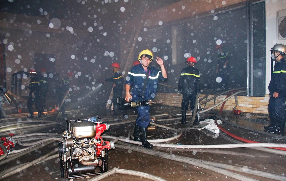 Cảnh sát phải huy động các phương tiện chuyên dụng để khống chế hỏa hoạn. Ảnh: Nguyễn Tân