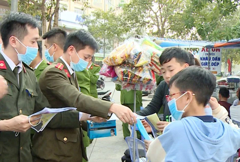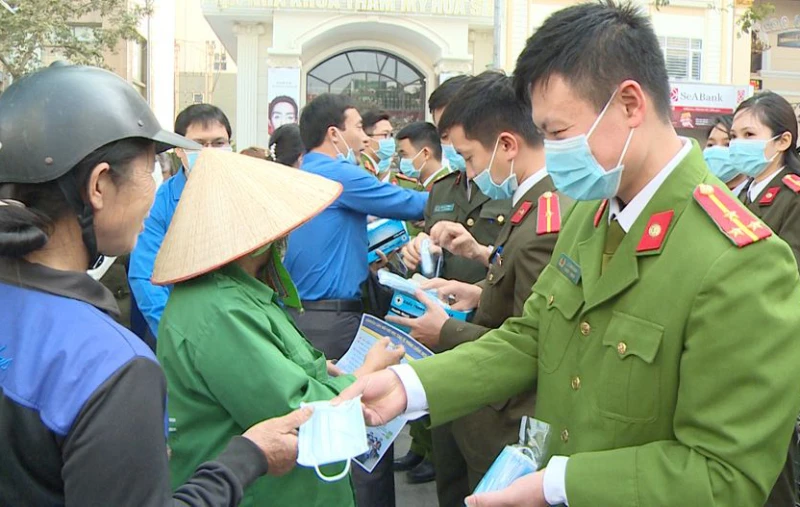 Tại những nơi tập trung đông người, cảnh sát cùng đoàn viên đã đến tận nơi trao hơn 1.000 khẩu trang bốn lớp miễn phí cho người dân.