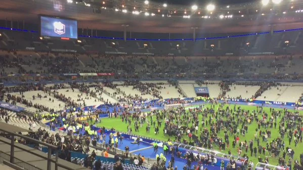 Tại sân vận động Stade de France, người xem đã được sơ tán xuống sân cỏ để tập trung đảm bảo an ninh. (Ảnh: Twitter)