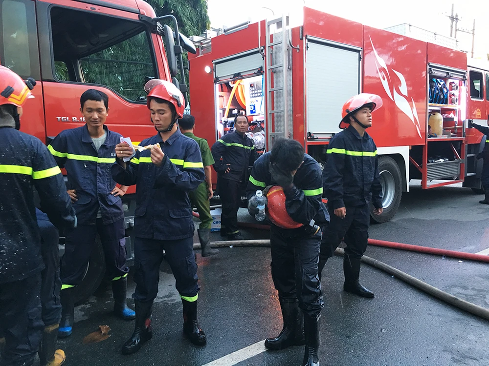 Các cán bộ chiến sĩ tranh thủ ăn, uống để tiếp tục dập lửa.