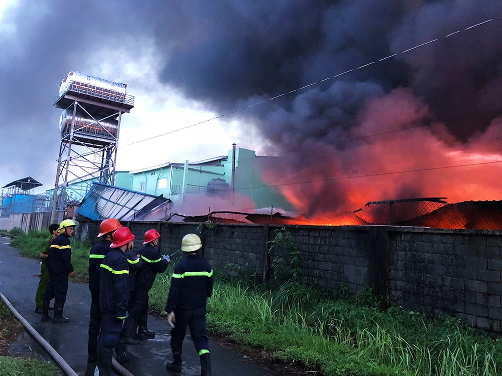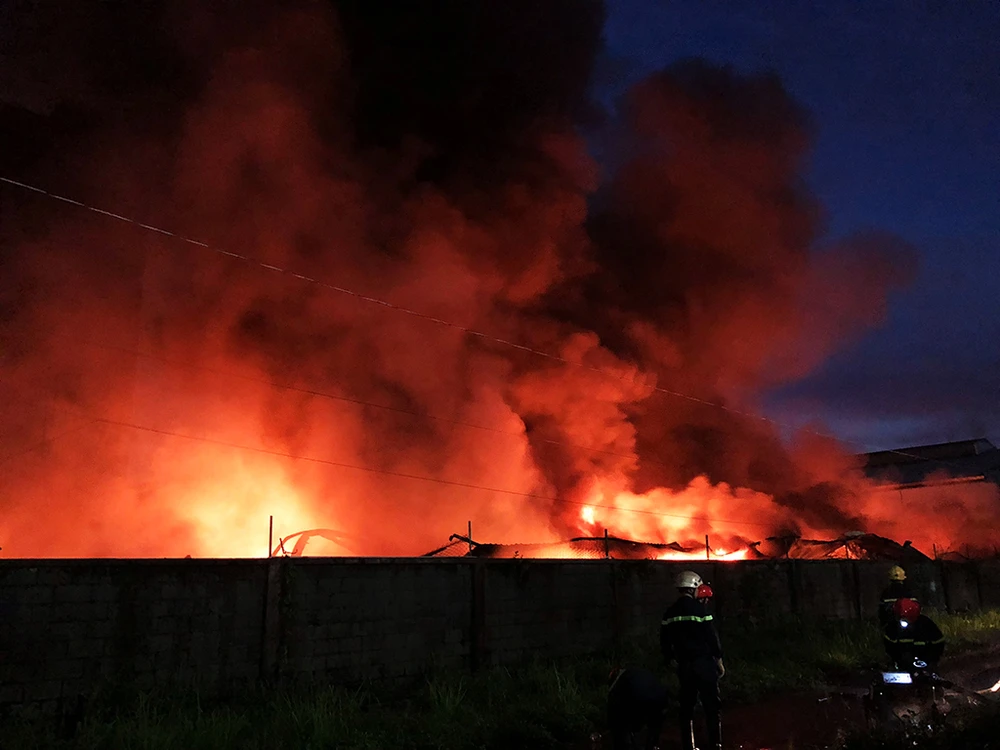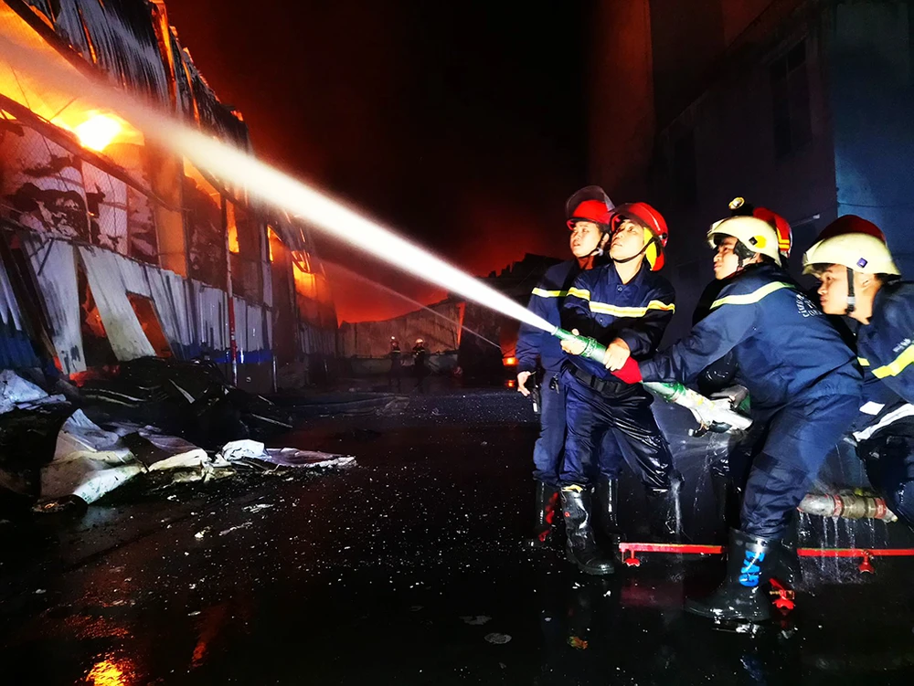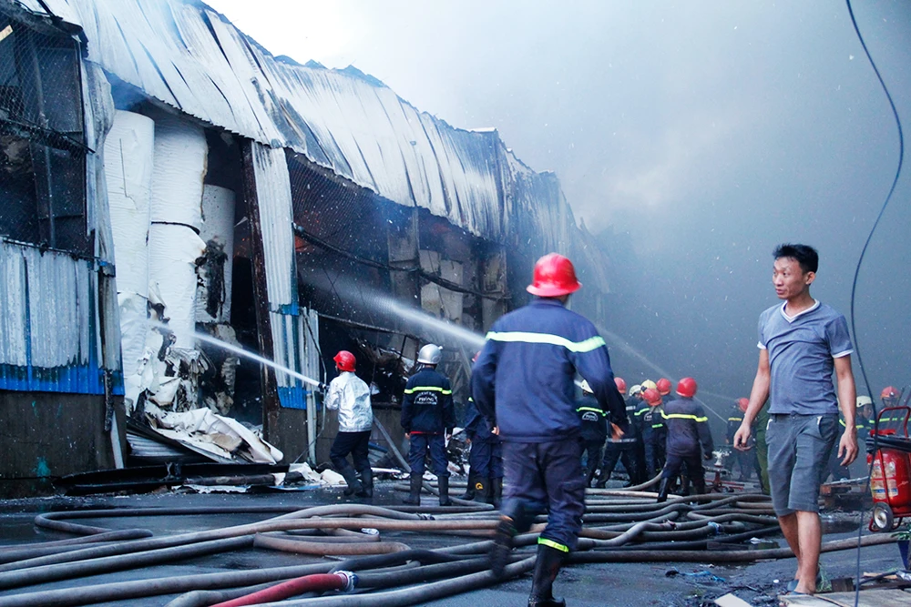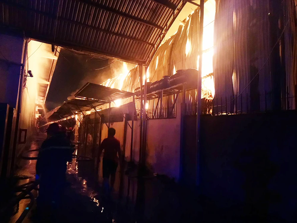 Hỏa hoạn xuất phát tại Công ty TNHH Thương mại Dịch vụ Phước Sinh tại Lô C 12/1, đường 2F thuộc Khu công nghiệp Vĩnh Lộc (huyện Bình Chánh, TP.HCM) đến 7 giờ sáng cùng ngày lực lượng chữa cháy vẫn tích cực phun nước khống chế hỏa hoạn.