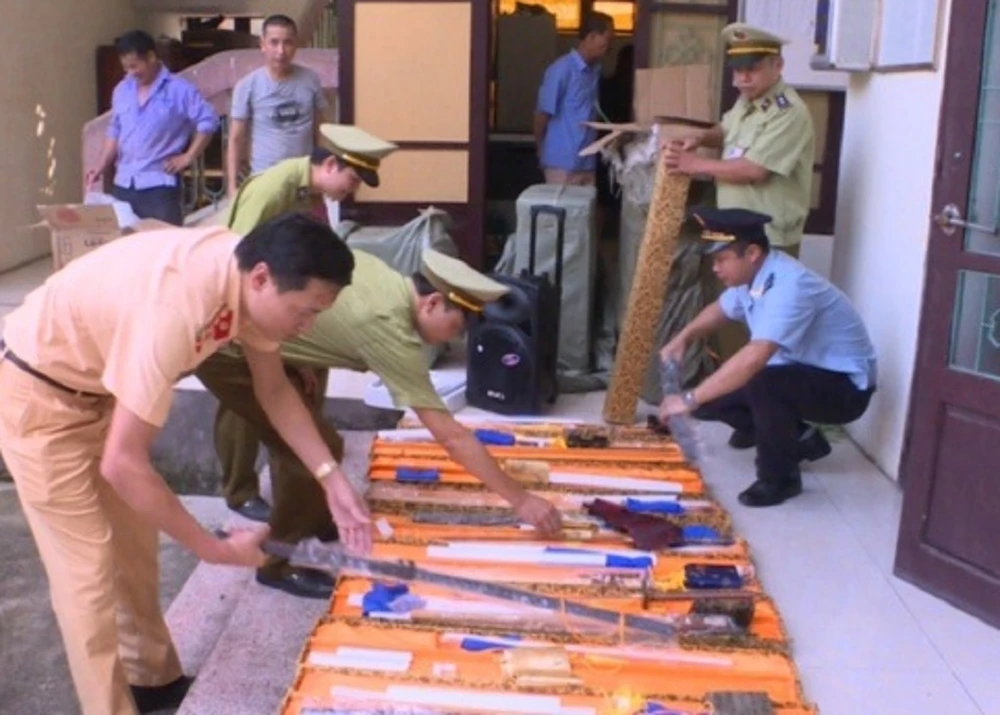 Qua kiểm tra, lực lượng CSGT phát hiện trên xe 20 cây kiếm dài 1 mét bằng kim loại (lưỡi kiếm sắc nhọn dài 70 cm, rộng 3,5 cm; chuôi kiếm dài 30cm, đường kính 04 cm) đựng trong hộp; 200 chiếc đài, 18 bộ loa đều không có hoá đơn, chứng từ.