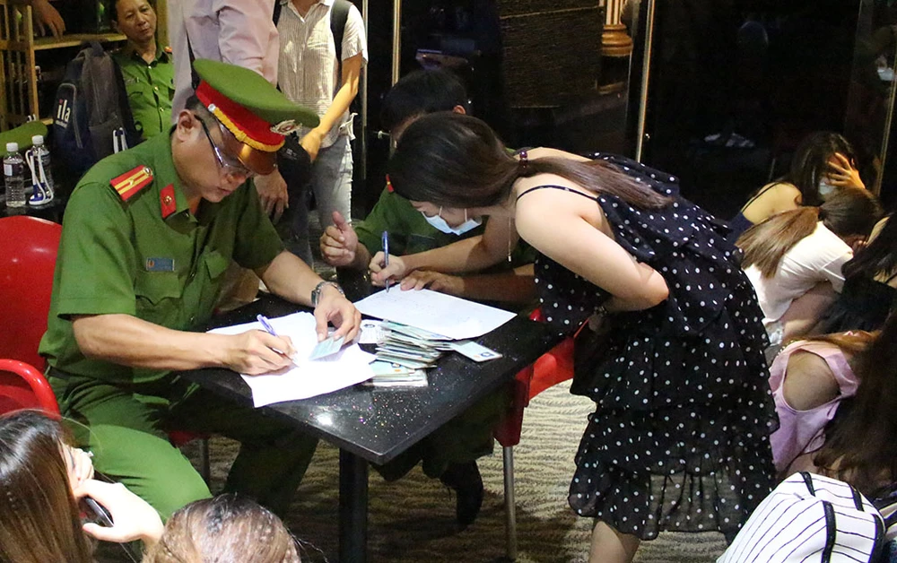 Tại đây, cảnh sát cũng lập biên bản xử lý vi phạm hành chính với các lỗi: Kinh doanh karaoke không phép, không đảm bảo công tác thoát hiểm-PCCC, sử dụng tiếp viên ngồi với khách không có hợp đồng lao động,…