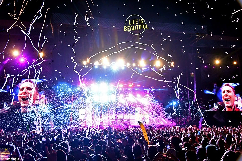 Hình ảnh được chụp lại tại lễ hội âm nhạc chỉ vài phút trước khi hung thủ ra tay xả súng xuống đám đông. Trên màn hình còn hiện lên dòng chữ "cuộc đời tươi đẹp" trước khi thảm kịch đau thương xảy ra. Ảnh: Film Magic