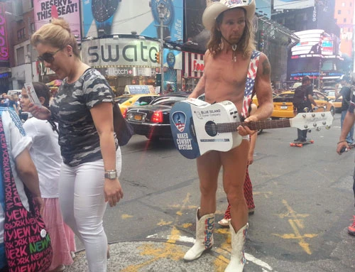 Trên nền chiếc quần lót màu trắng, dòng chữ “Naked Cowboy” (cao bồi khỏa thân) càng nổi bật với 2 màu xanh đỏ, vốn được xem như hai màu mang tính biểu tượng quốc gia của Mỹ. Chàng cao bồi này chẳng phải “đồ điên lên cơn”, mà anh đang kiếm tiền mưu sinh, rất nhiều phụ nữ, từ trẻ đến già, hào hứng đề nghị chụp hình chung với đủ tư thế: bồng bế, ôm ấp... Có cô lém lỉnh đưa hờ tay lên mông chàng cao bồi để chụp hình. Ai chụp chung phải trả 5 USD (khoảng 110.000 đồng). Chỉ trong một giờ, anh ta kiếm được kha khá khi chụp hình cùng hàng chục người.