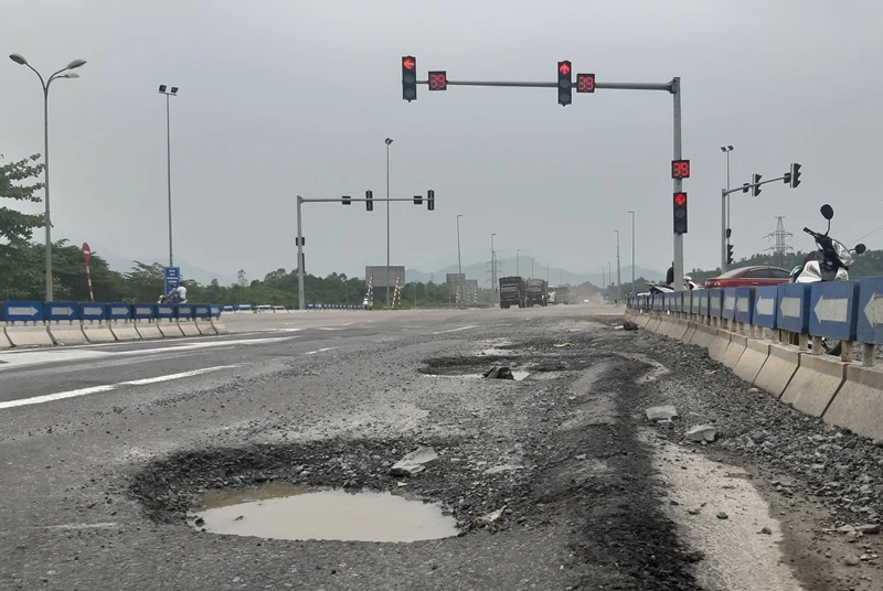 Theo ghi nhận của PV, đầu tuyến cao tốc Đà Nẵng – Quảng Ngãi, đoạn giao với Quốc lộ 14B và đường tránh Nam Hải Vân (xã Hòa Nhơn, huyện Hòa Vang) đang xuất hiện các ổ gà lớn. Các ổ gà có bề ngang chỗ rộng nhất khoảng 0,5 m, chỗ dài nhất khoảng 1 m, tạo thành các vũng nước mưa. Cũng tại vị trí này xuất hiện sống trâu nhấp nhô, gây mất ATGT.