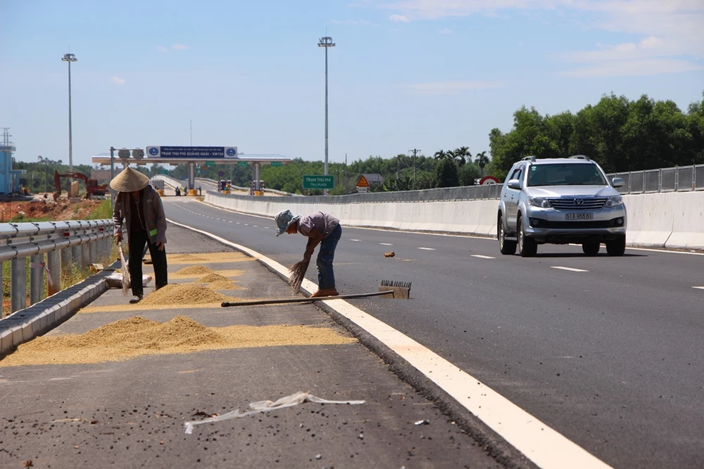 Cạnh Trạm thu phí Quảng Ngãi, tình trạng người dân phơi thóc trên mặt đường cao tốc vẫn diễn ra. Ảnh: TẤN VIỆT
