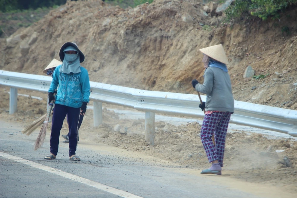 Công nhân tập trung quét dọn mặt đường, sẵn sàng thông xe. Ảnh: TẤN VIỆT