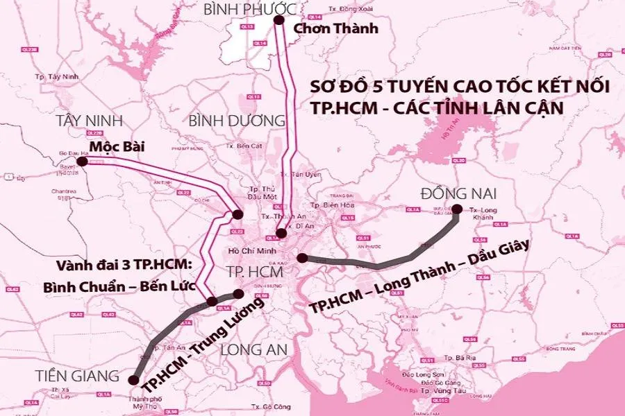 Sơ đồ năm tuyến cao tốc kết nối TP.HCM đi các tỉnh lân cận.