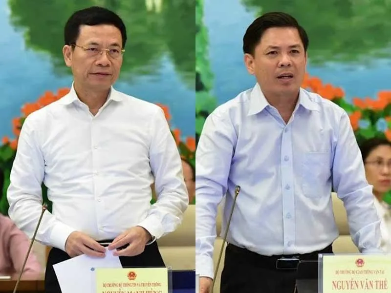 Bộ trưởng Bộ TT&TT Nguyễn Mạnh Hùng và Bộ trưởng GTVT Nguyễn Văn Thể (phải) trả lời chất vấn. Ảnh: QH