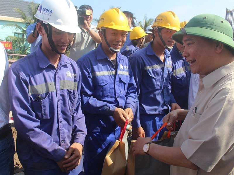Thủ tướng tặng quà cho công nhân thi công công trình cao tốc. Ảnh: ĐÔNG HÀ