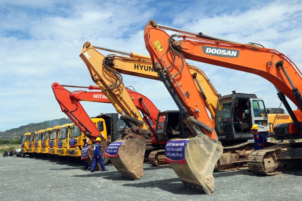 Đoàn cơ giới của nhà thầu chuẩn bị thi công. Ảnh: PN