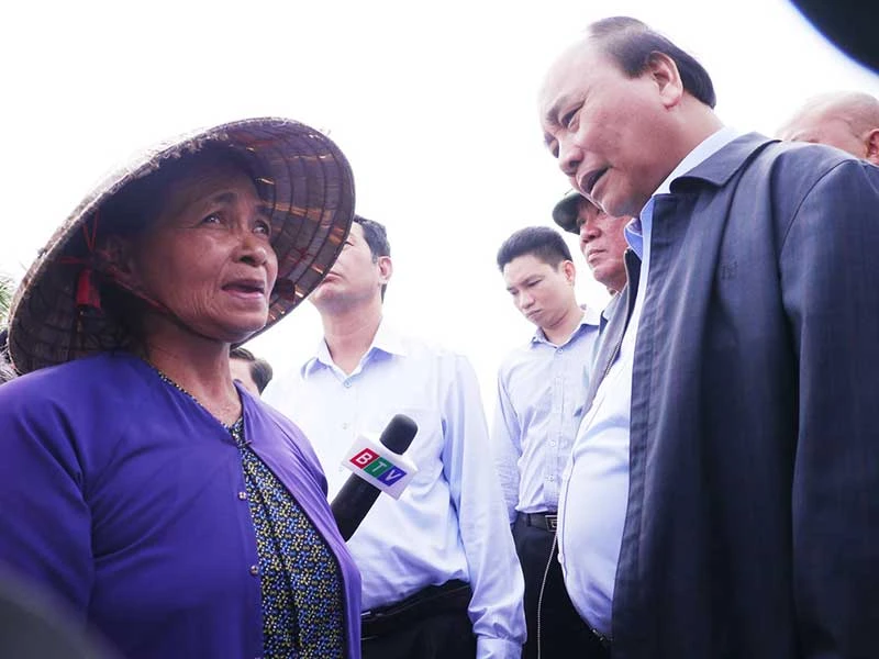 Thủ tướng Nguyễn Xuân Phúc động viên, chia sẻ với người dân huyện Phù Mỹ (Bình Định) bị thiệt hại do mưa lũ. Ảnh: HT