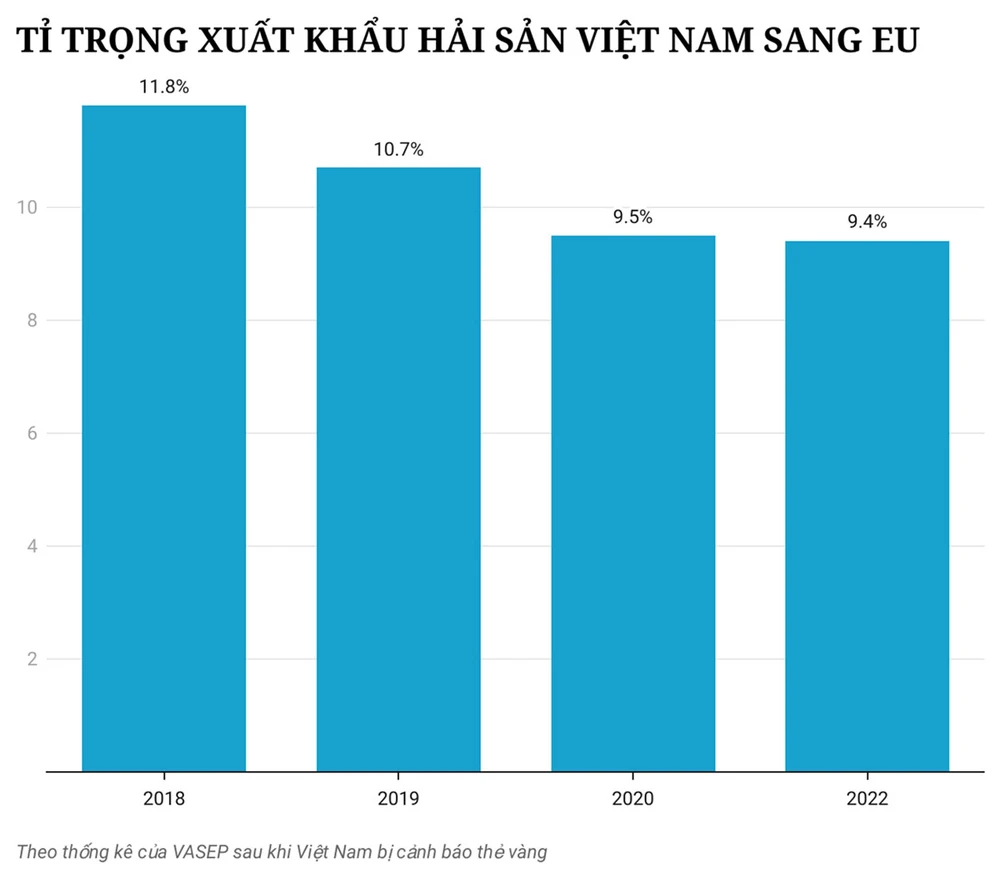 Thế nhưng từ sau khi bị cảnh báo thẻ vàng IUU, tỉ trọng xuất khẩu hải sản của VN sang EU giảm dần qua từng năm. Qua thống kê của VASEP, năm 2018 - năm đầu tiên sau khi bị cảnh báo thẻ vàng, tỉ trọng xuất khẩu hải sản sang EU chiếm 11,8%. Sang năm 2019, con số này suy giảm còn 10,7% và còn 9,5% vào năm 2020. Đến năm 2022, sau năm năm, tỉ trọng đã giảm còn 9,4%.