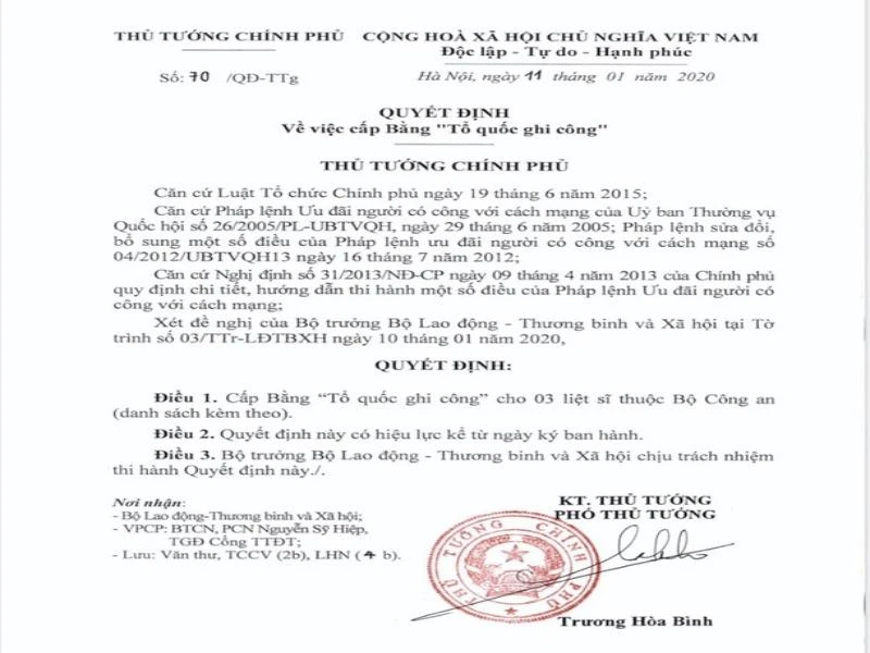 Quyết định được Phó Thủ tướng Trương Hòa Bình ký (ngày 11-1) sau khi Bộ LĐ-TB&XH có tờ trình gửi Thủ tướng Chính phủ về việc cấp bằng Tổ quốc ghi công cho ba cán bộ, chiến sĩ thuộc Bộ Công an đã hy sinh trong khi làm nhiệm vụ trấn áp tội phạm tại xã Đồng Tâm.