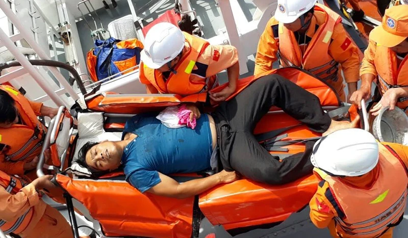 Thuyền viên được tàu cứu hộ đưa vào bờ chữa trị.