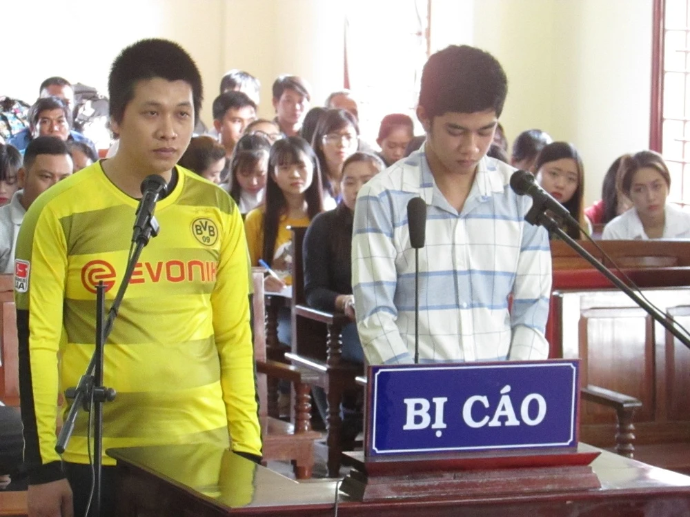 Hai bị cáo Bình và Hiếu tại phiên tòa sơ thẩm ngày 27-3. Ảnh: NN